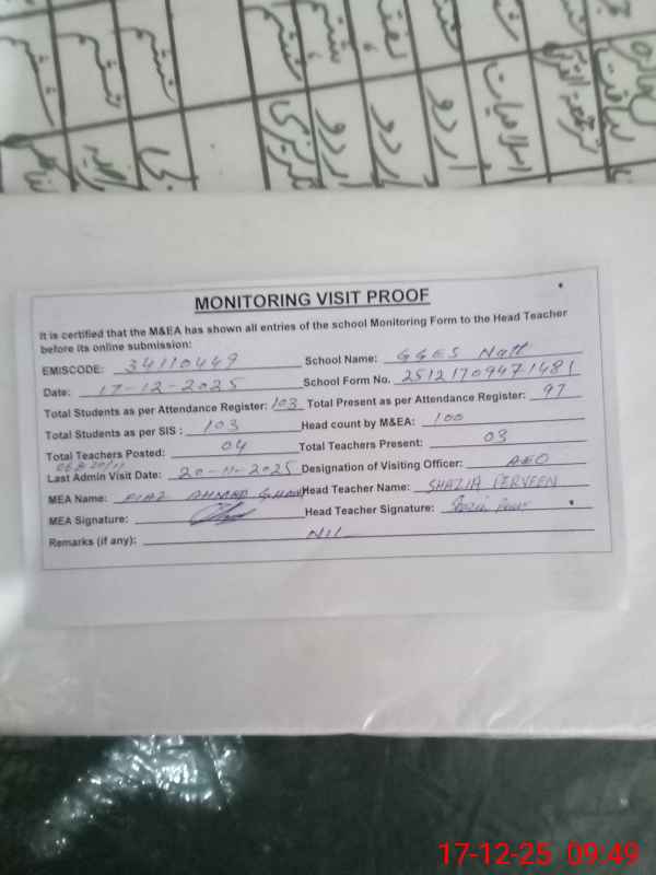| Remarks (Use Separate Page if Required): Attendance of teaching staff and students on SIS Software is not updated Data as per provided by School Staff and found during physical visit | |||||