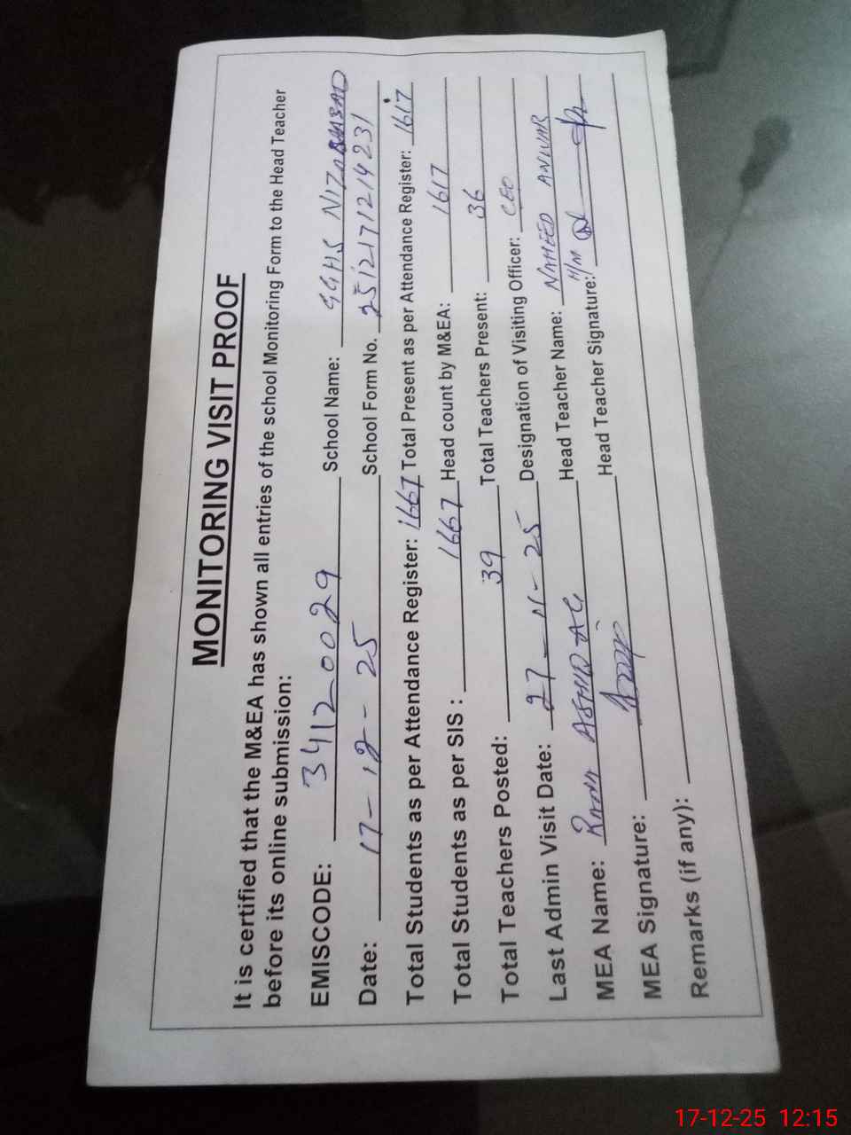 | Attendance Register | Head Teacher | MEA with School | Visit Proof |
