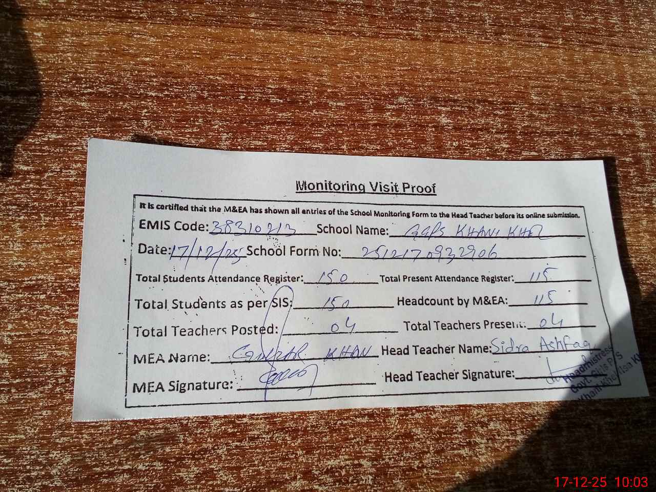 | Attendance Register | Head Teacher | MEA with School | Visit Proof |