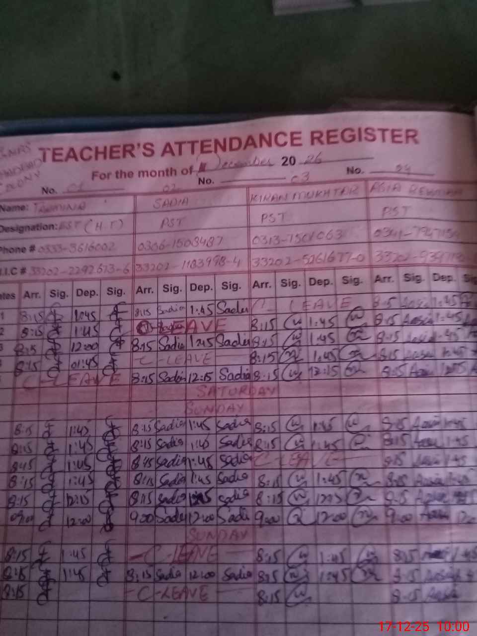 | CNIC | Full Name | Designation | R/C | Absence During Last Calender Month |