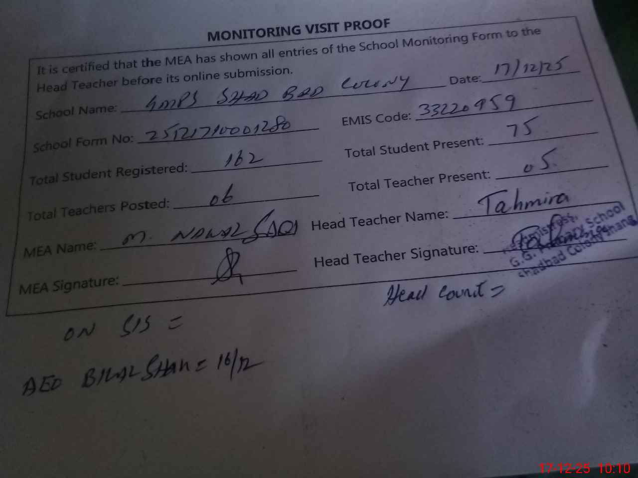 | Attendance Register | Head Teacher | MEA with School | Visit Proof |