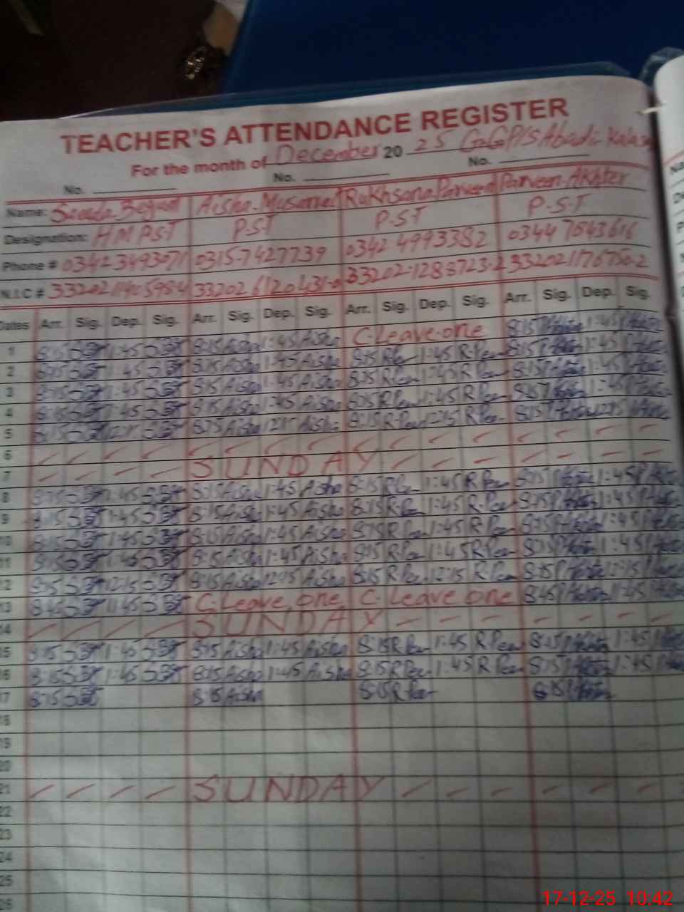| CNIC | Full Name | Designation | R/C | Absence During Last Calender Month |