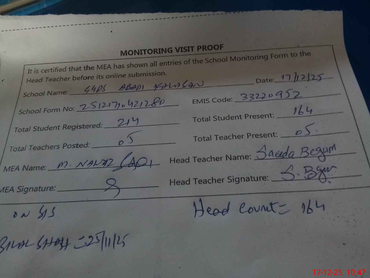 | Attendance Register | Head Teacher | MEA with School | Visit Proof |
