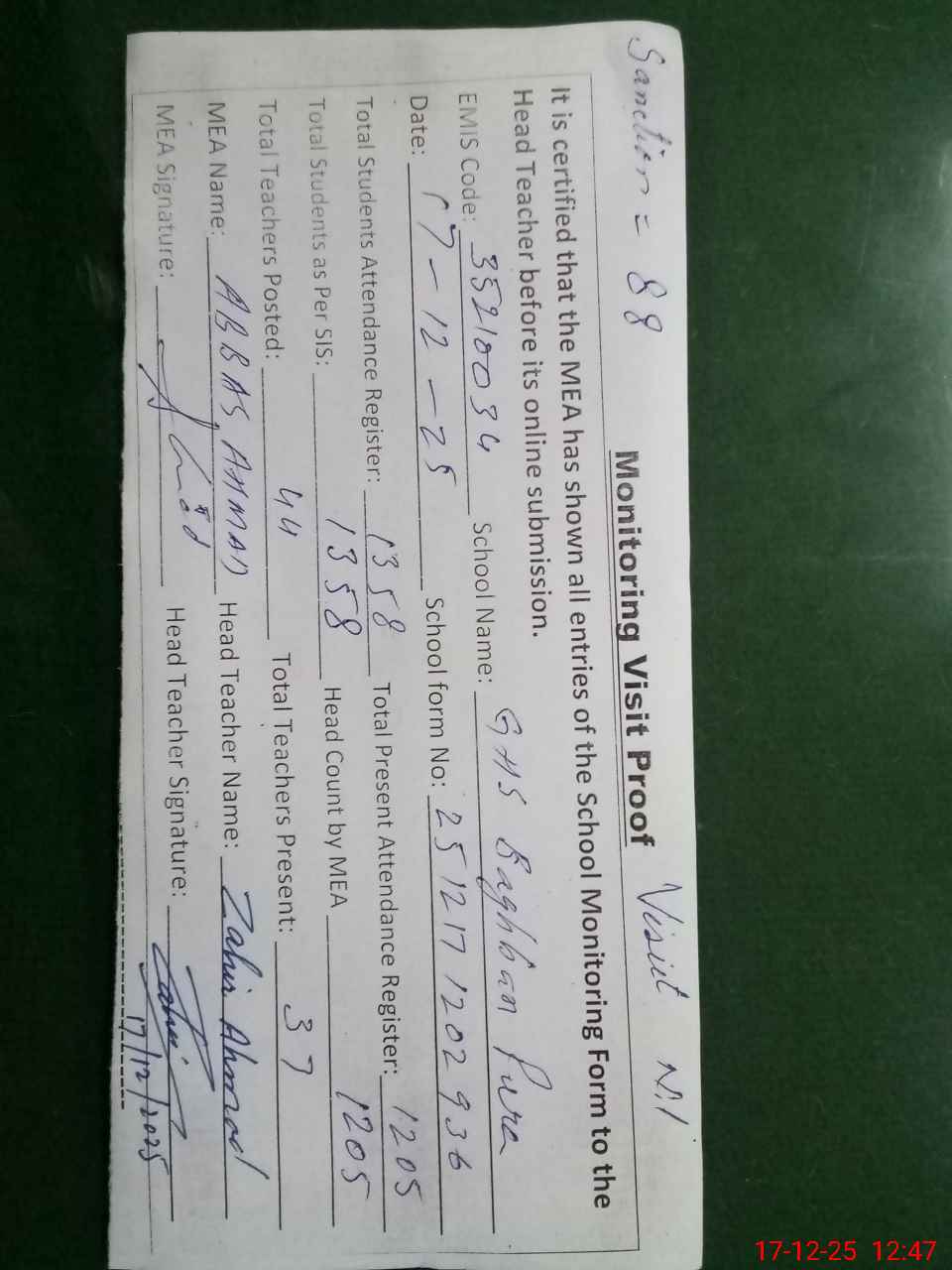 | Attendance Register | Head Teacher | MEA with School | Visit Proof |