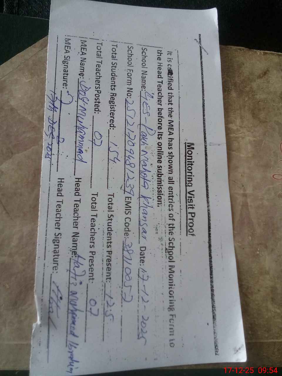 | Remarks (Use Separate Page if Required): All the entered data loudly share with the head teacher before submitting Last visited the subject school by educational authority Naeem Abbas AEO Dated 25th November 2025 | |||||