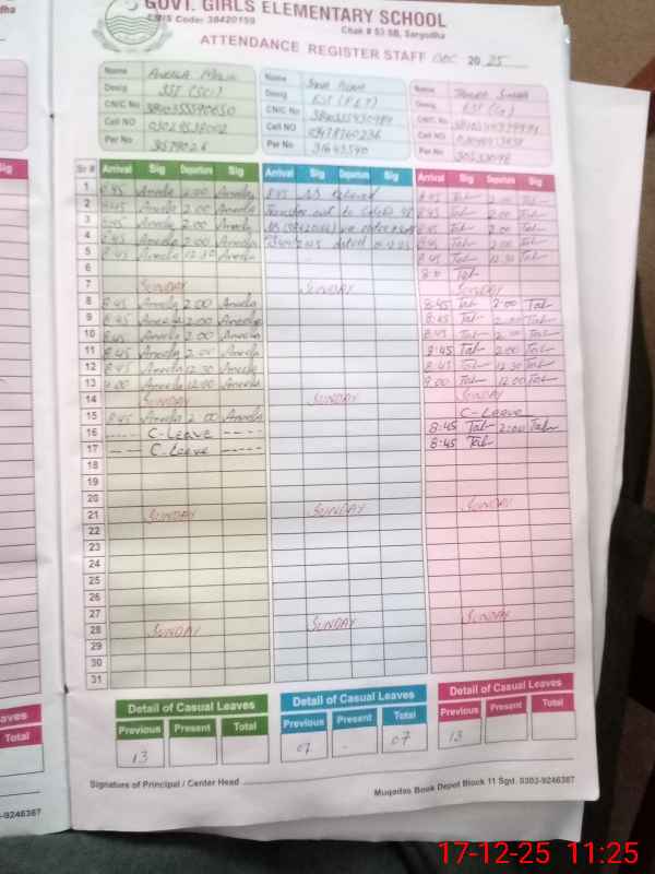 | CNIC | Full Name | Designation | R/C | Absence During Last Calender Month |