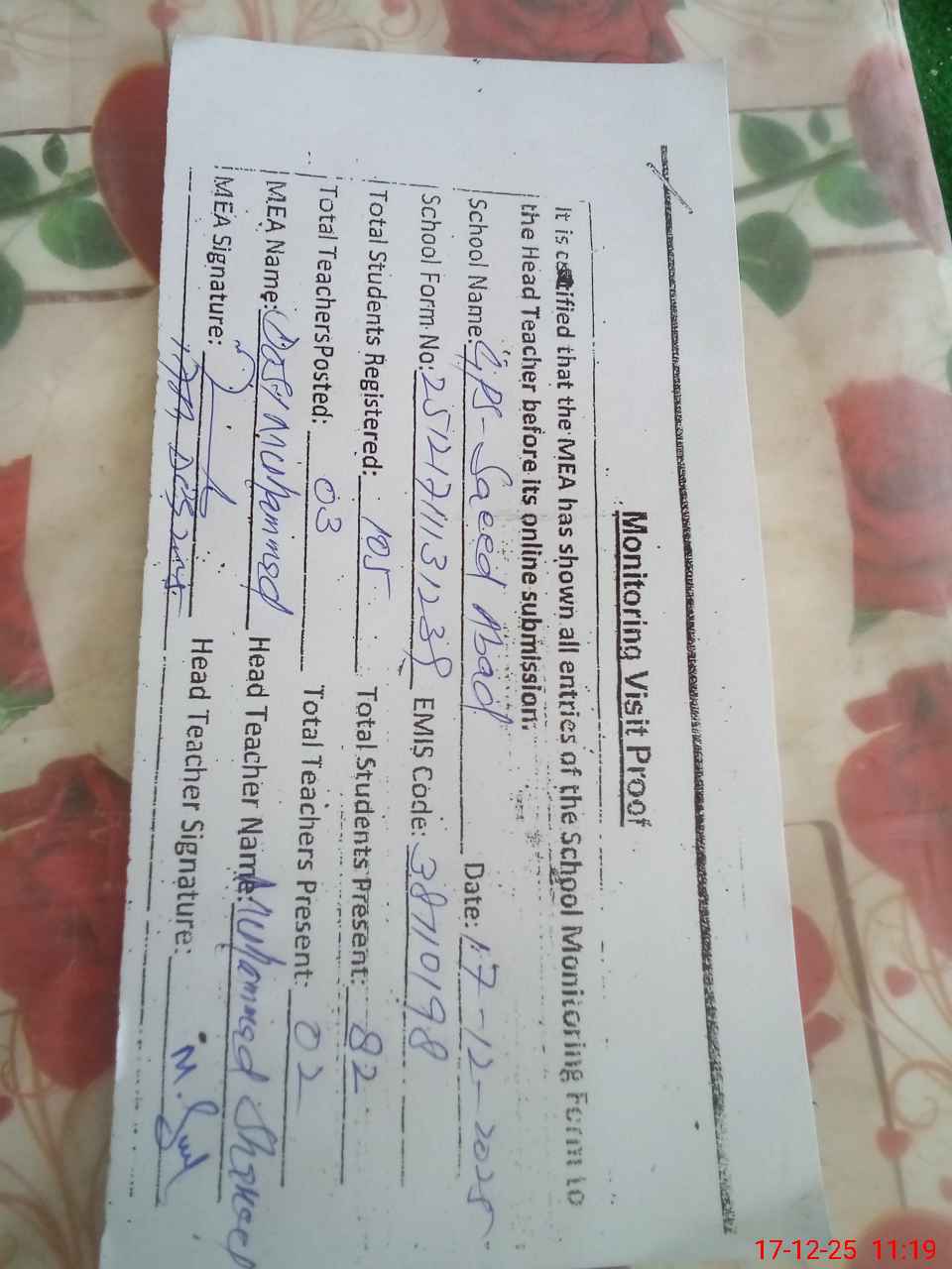 | Attendance Register | Head Teacher | MEA with School | Visit Proof |