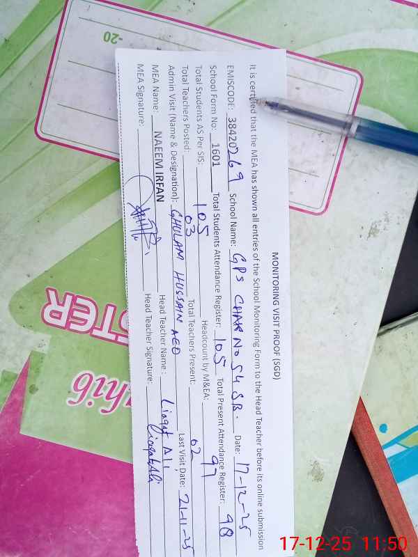 | EMIS Code: 38420269 | Name of School: GPS CHAK NO.54 SB | |||