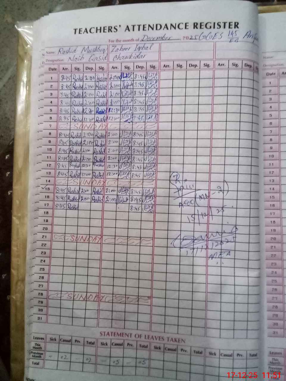 | CNIC | Full Name | Designation | R/C | Absence During Last Calender Month |