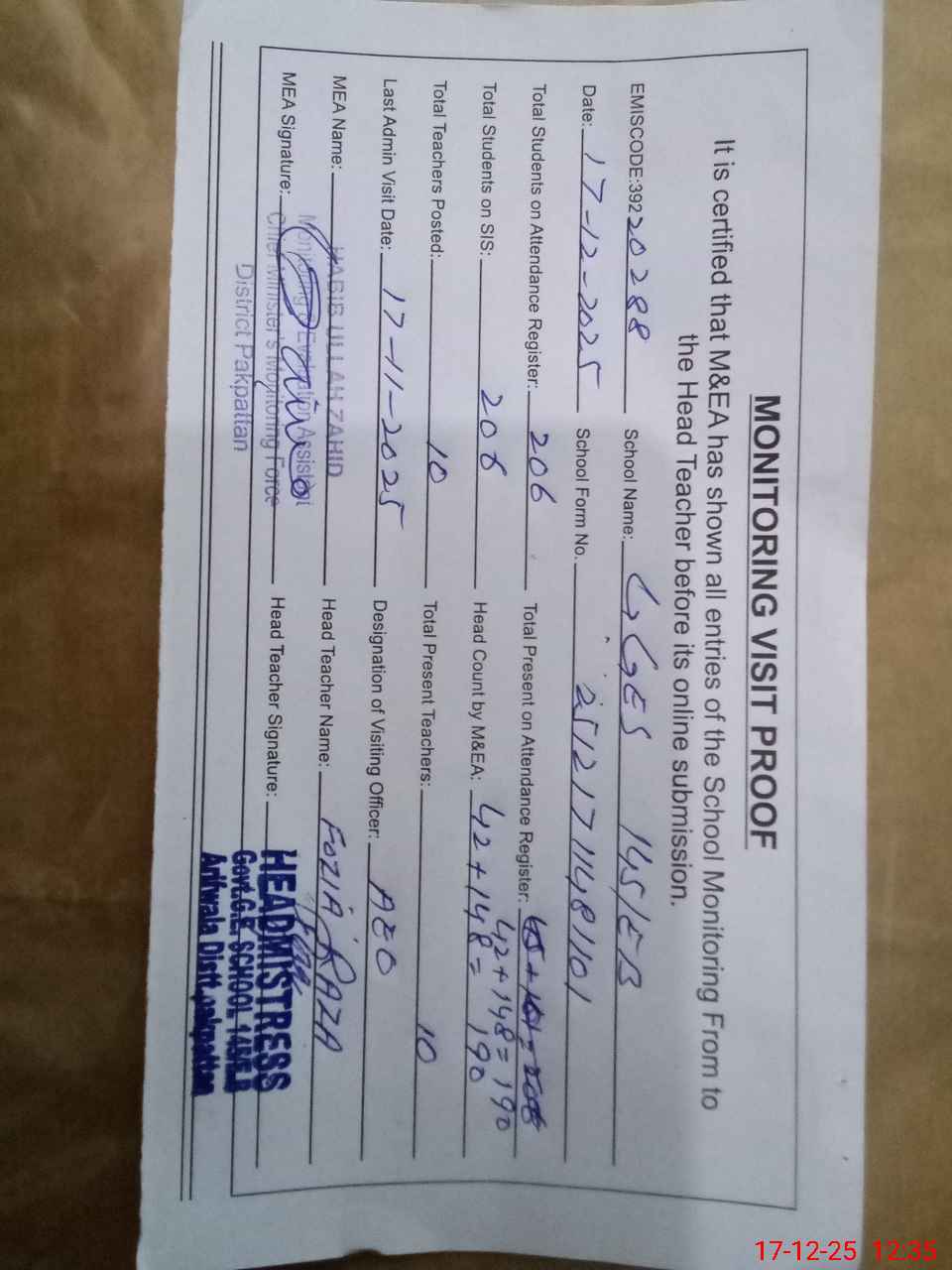 | Attendance Register | Head Teacher | MEA with School | Visit Proof |