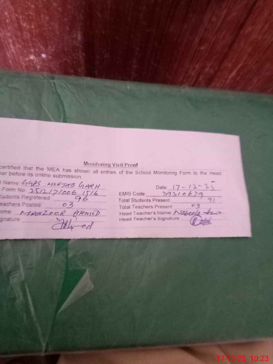 | EMIS Code: 39310679 | Name of School: GGPS MEHTAB GARH | |||