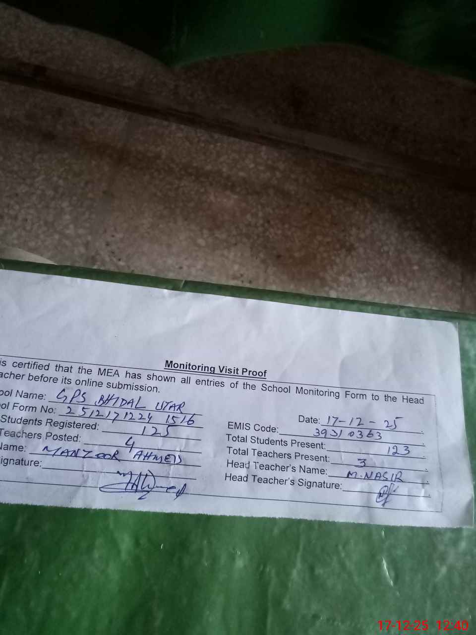 | Attendance Register | Head Teacher | MEA with School | Visit Proof |