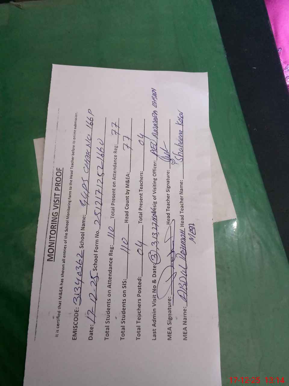 | Attendance Register | Head Teacher | MEA with School | Visit Proof |