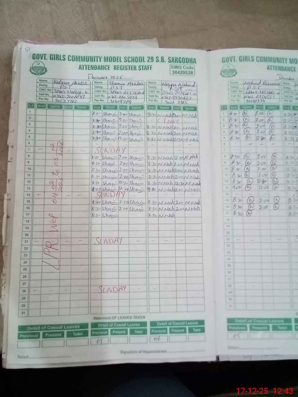 | CNIC | Full Name | Designation | R/C | Absence During Last Calender Month |