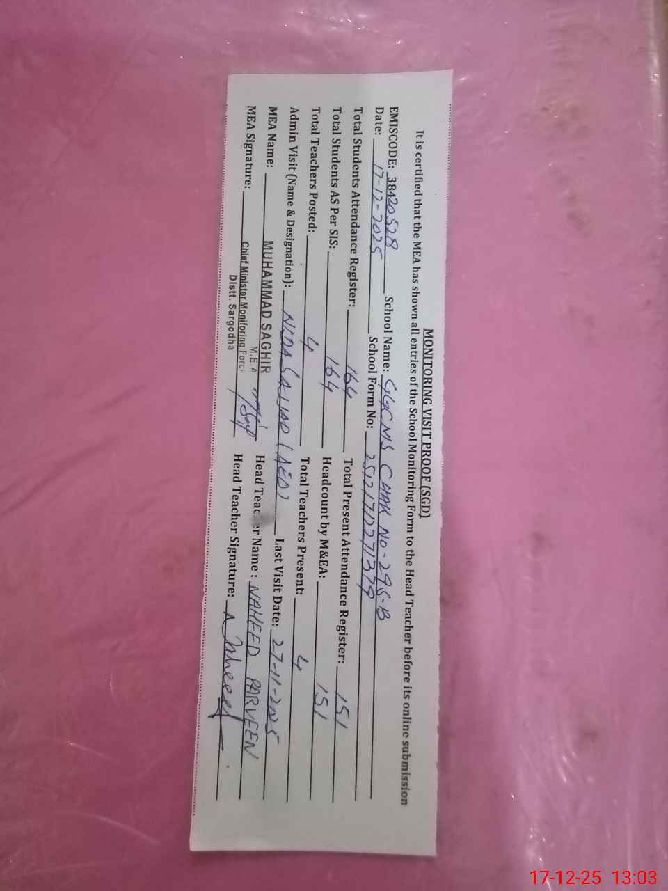 | Attendance Register | Head Teacher | MEA with School | Visit Proof |
