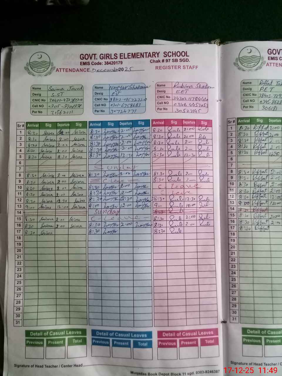 | CNIC | Full Name | Designation | R/C | Absence During Last Calender Month |