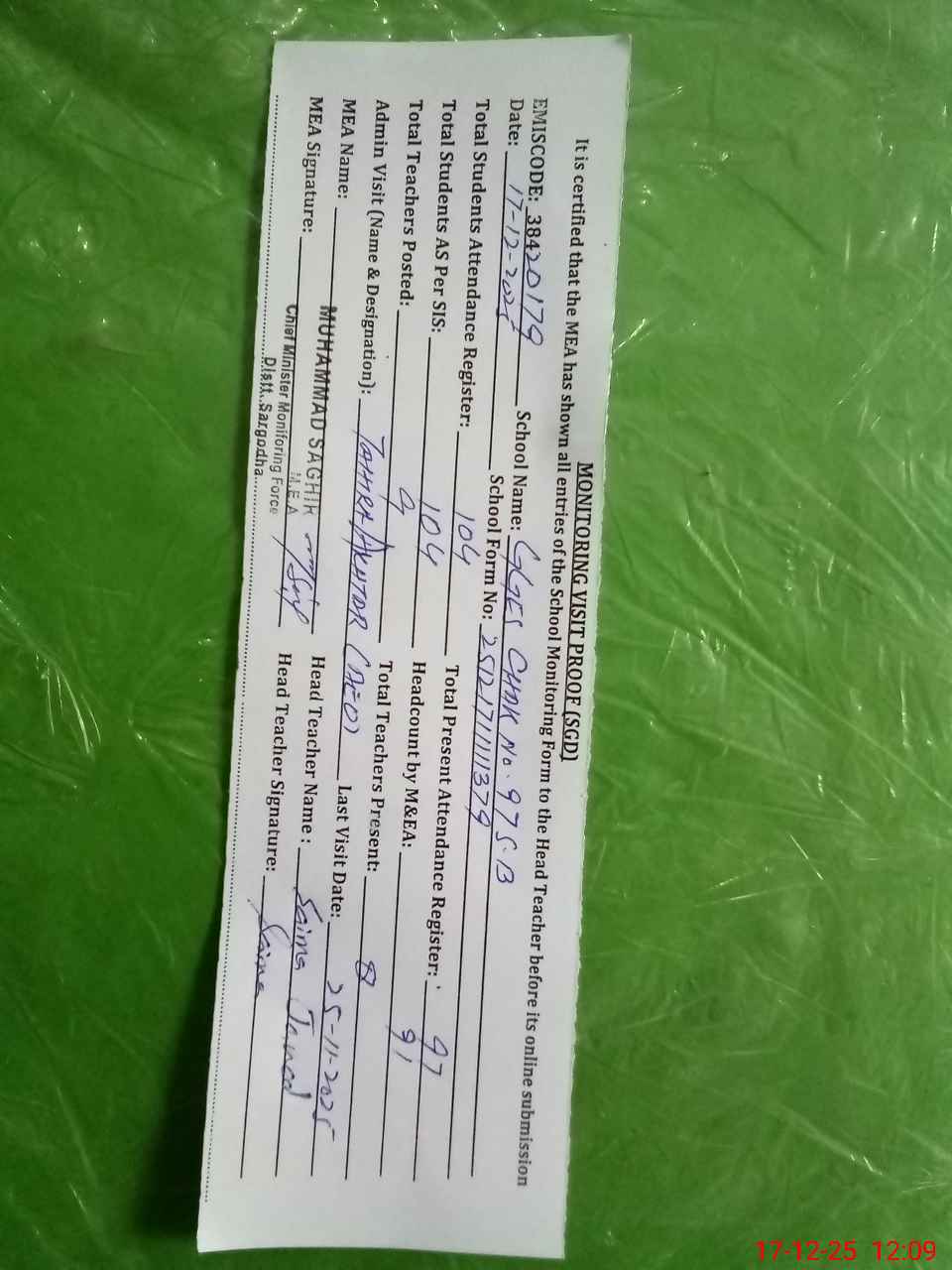 | Attendance Register | Head Teacher | MEA with School | Visit Proof |