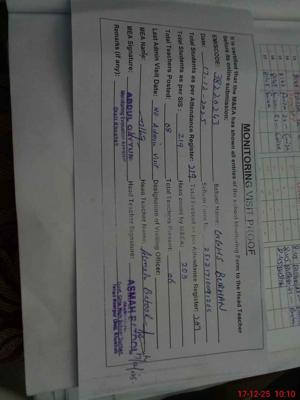 | EMIS Code: 38220243 | Name of School: GGHS BURHAN | |||