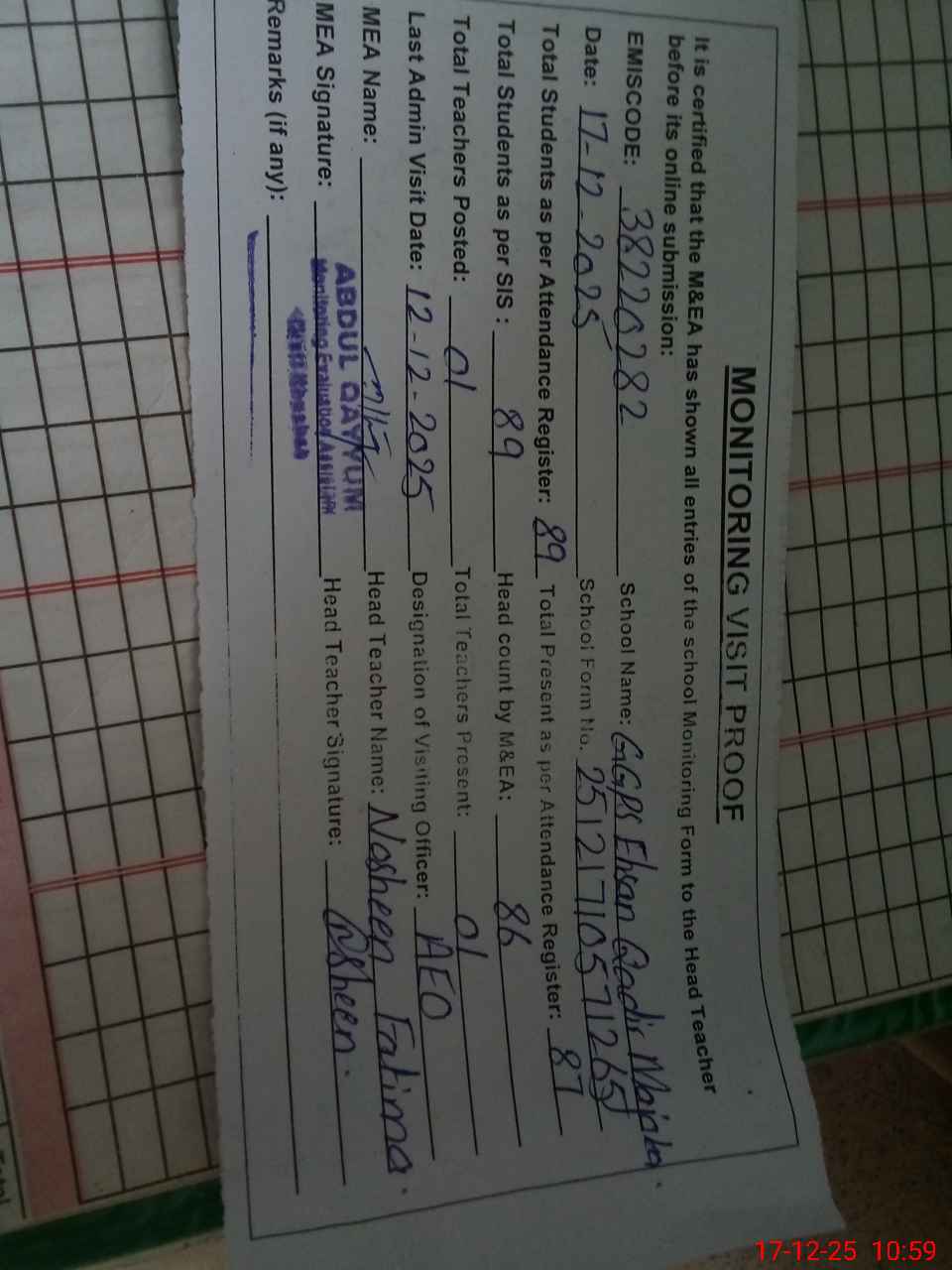| Attendance Register | Head Teacher | MEA with School | Visit Proof |