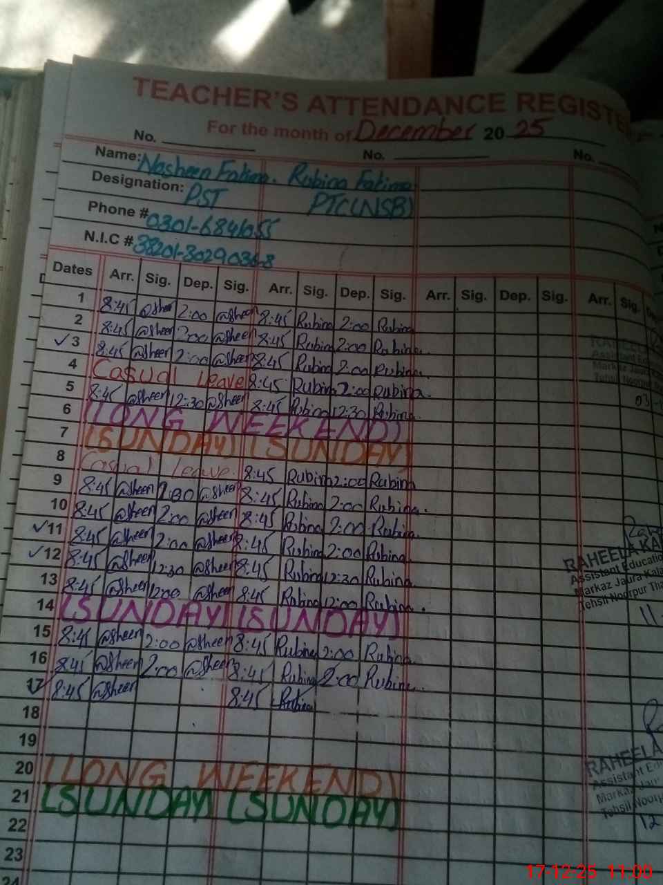 | CNIC | Full Name | Designation | R/C | Absence During Last Calender Month |