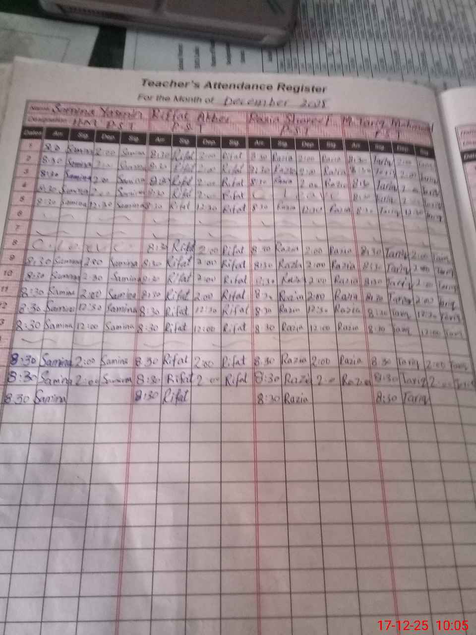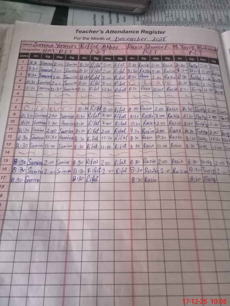 | CNIC | Full Name | Designation | R/C | Absence During Last Calender Month |