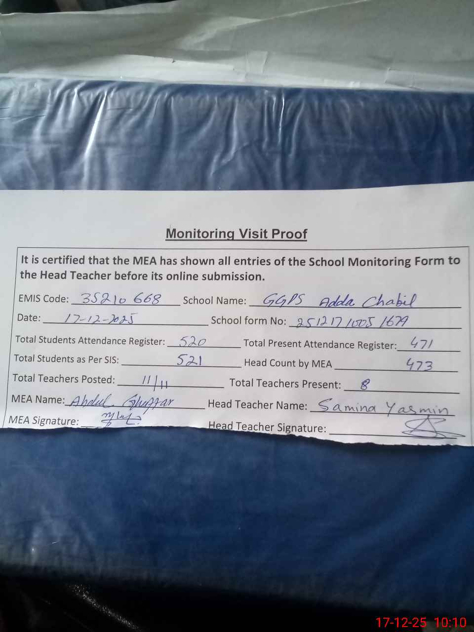 | Attendance Register | Head Teacher | MEA with School | Visit Proof |