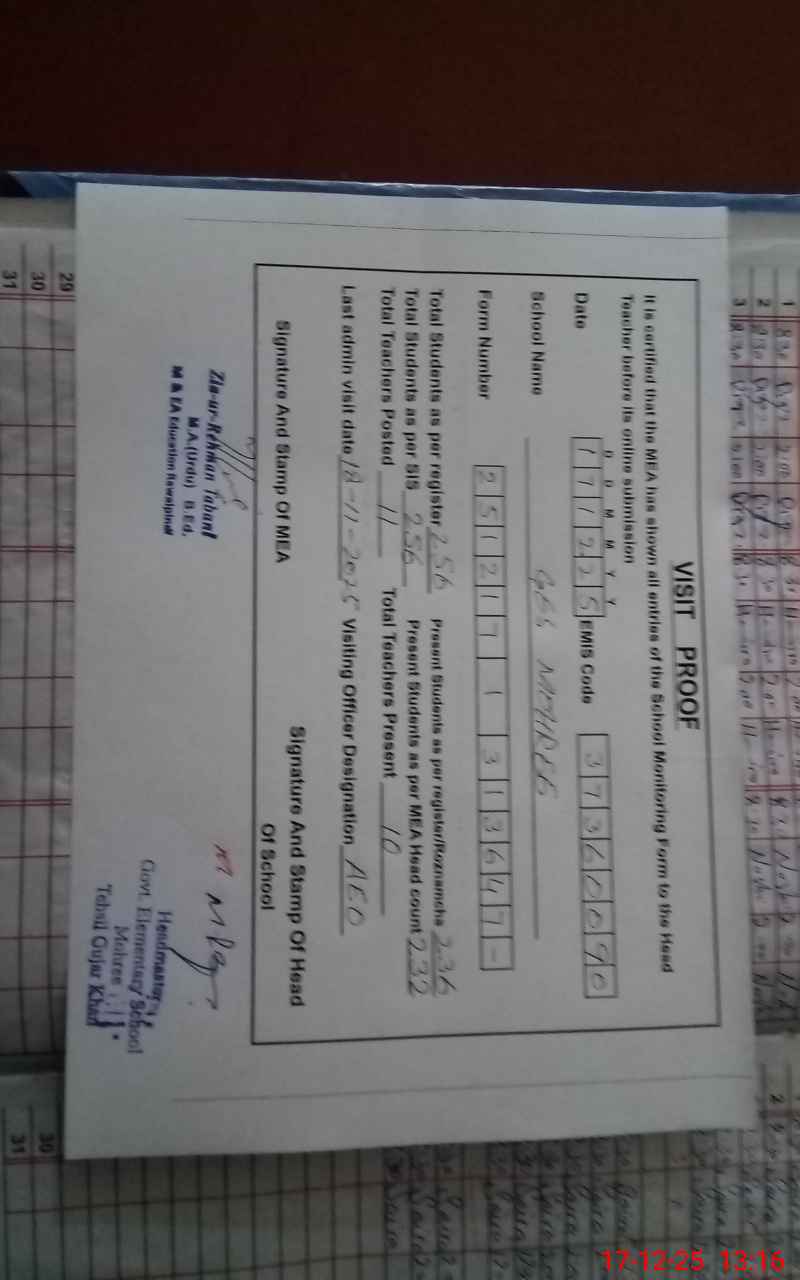 | Attendance Register | Head Teacher | MEA with School | Visit Proof |