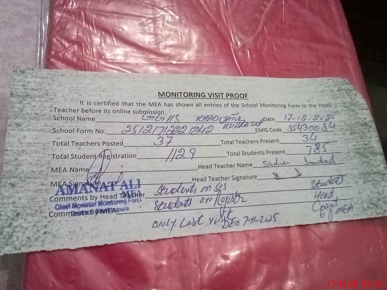| Certified that this School was Inspected by the Undersigned MEA/DMO Today and the Information Stated Above is as Per Record. | |||||