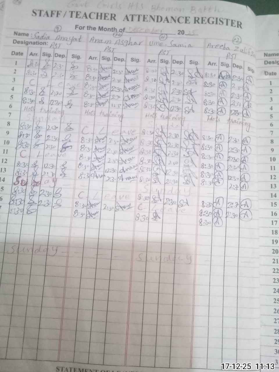 | CNIC | Full Name | Designation | R/C | Absence During Last Calender Month |