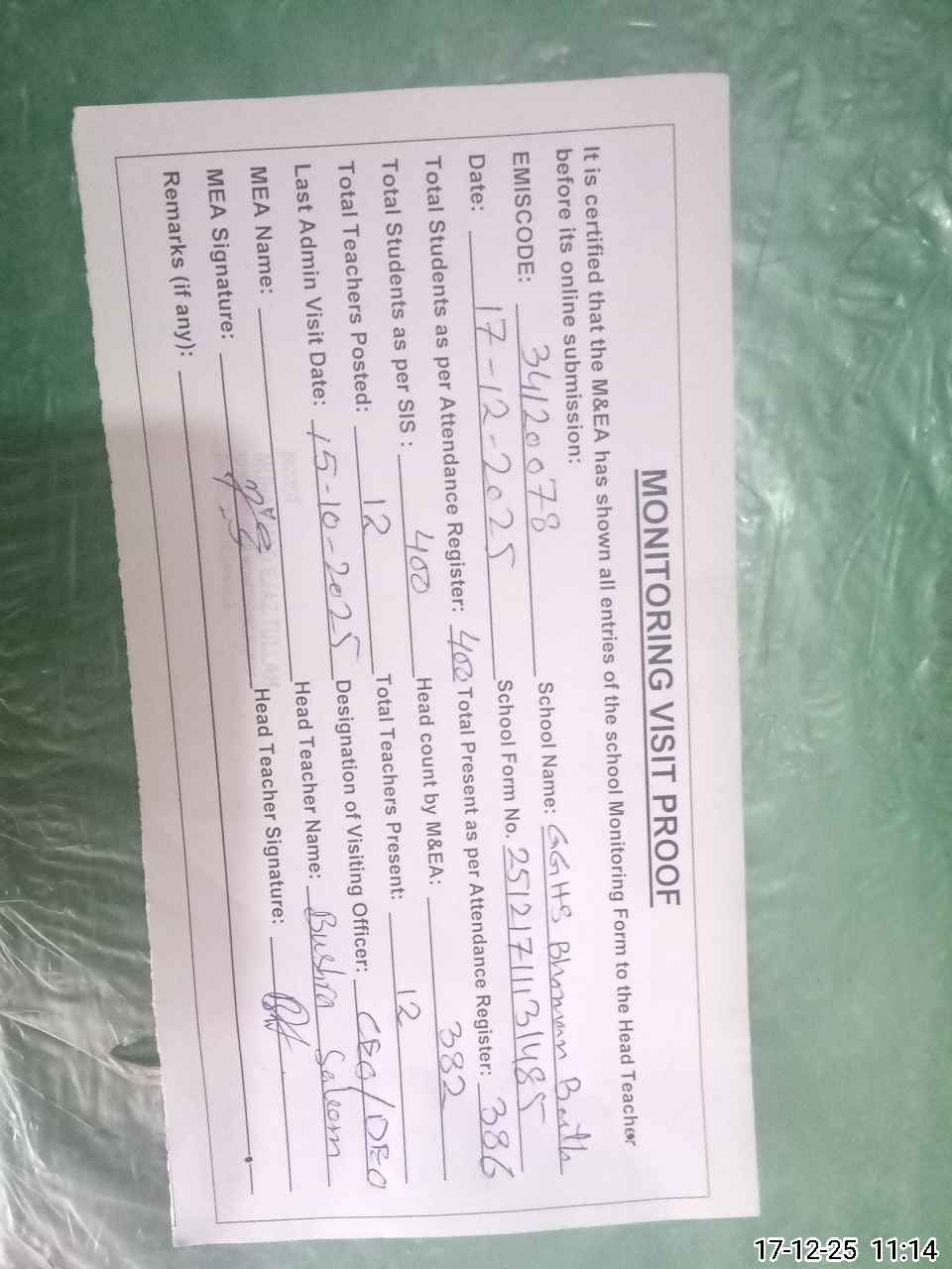 | Attendance Register | Head Teacher | MEA with School | Visit Proof |