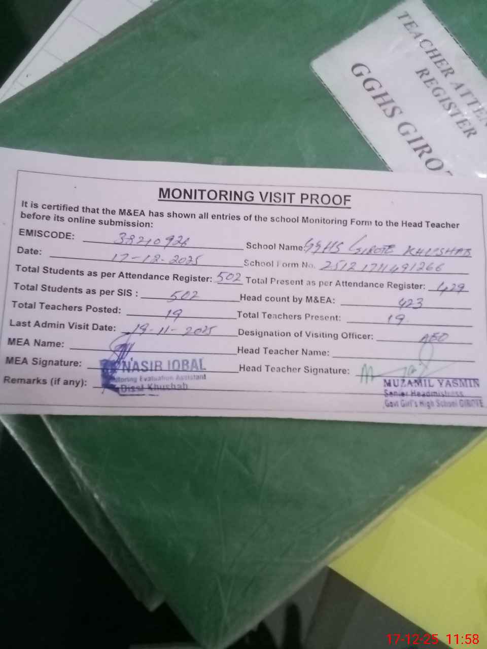 | Attendance Register | Head Teacher | MEA with School | Visit Proof |