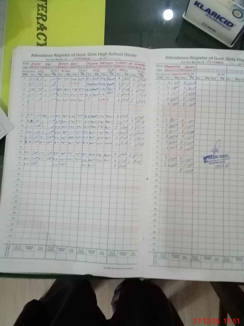 | CNIC | Full Name | Designation | R/C | Absence During Last Calender Month |