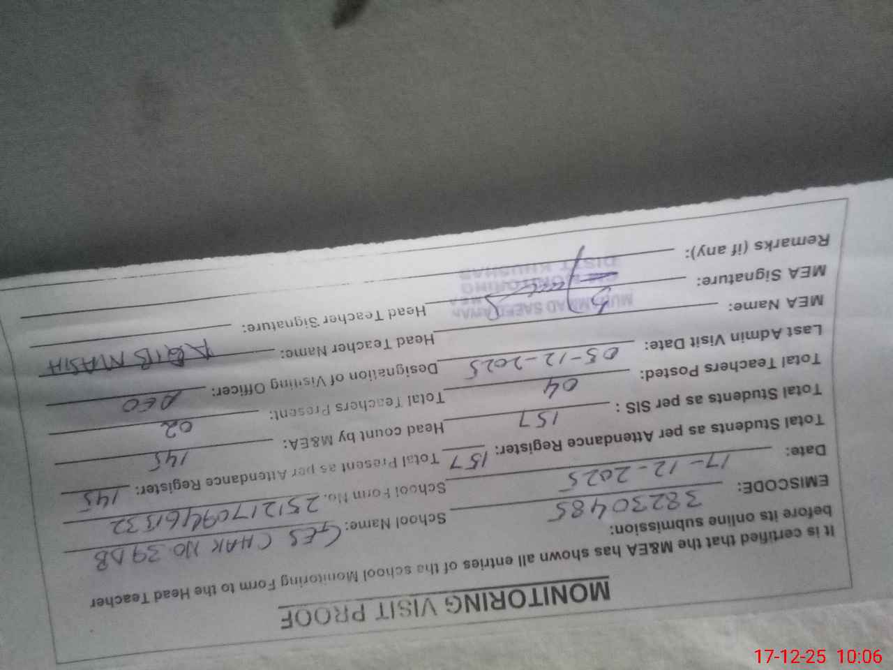 | Remarks (Use Separate Page if Required): Students on SIS QTY 157 Last admin visit On 05 December 2025 by AEO | |||||