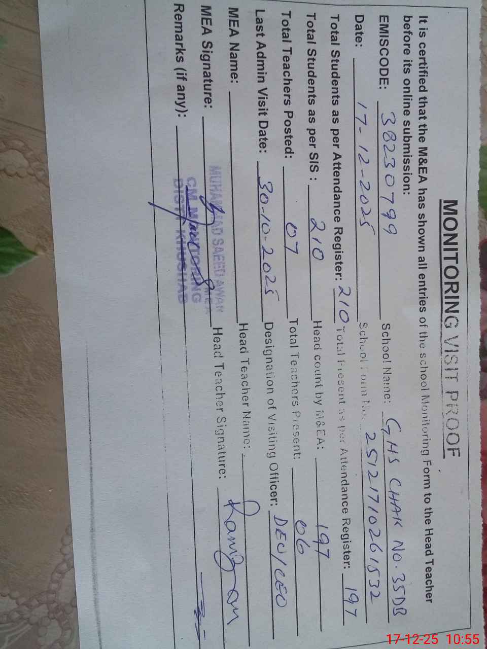 | EMIS Code: 38230799 | Name of School: GHS CHAK NO 35 DB | |||