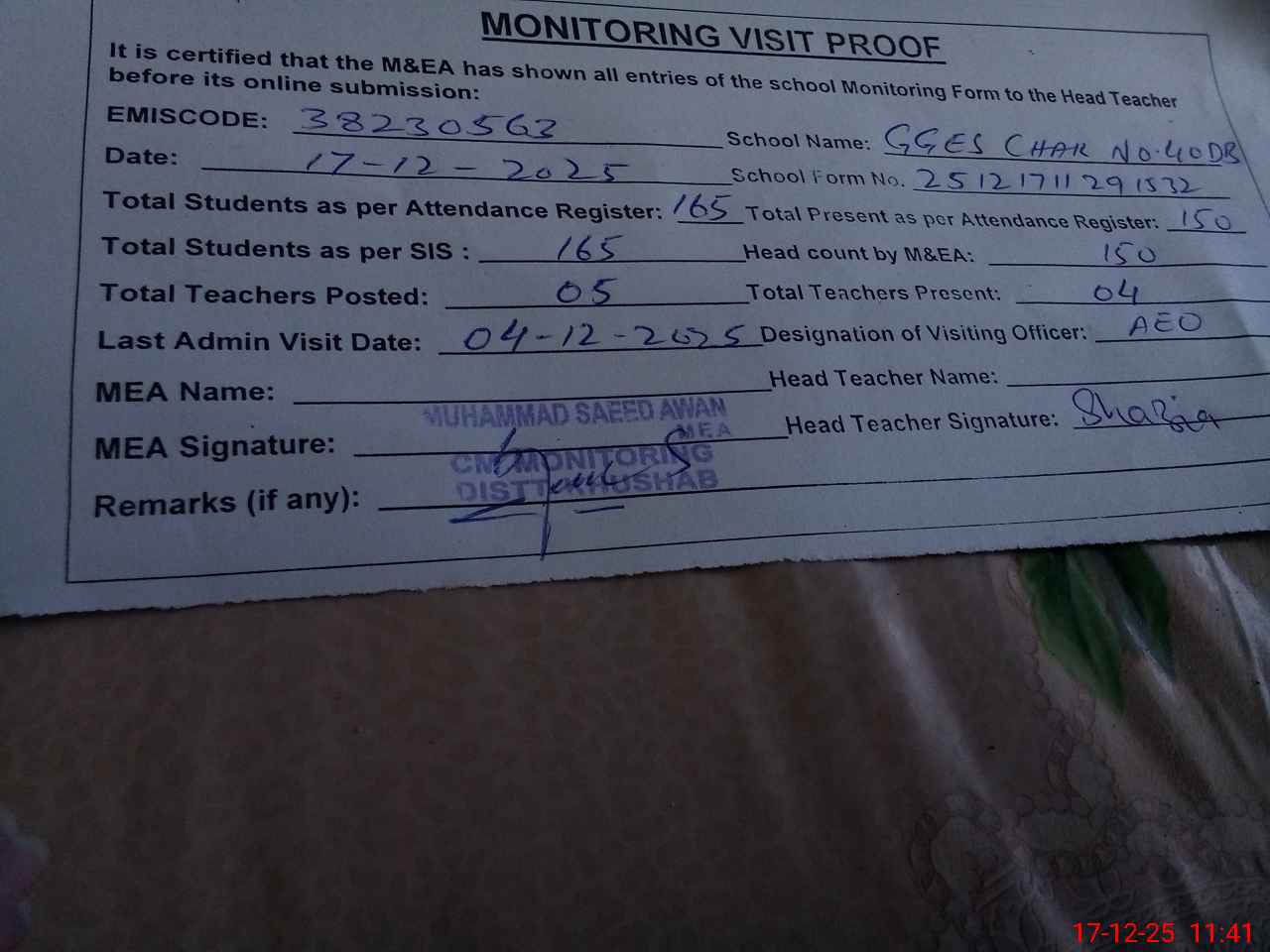 | Remarks (Use Separate Page if Required): Students on SIS QTY 165 Last admin visit On 04 December 2025 by AEO | |||||