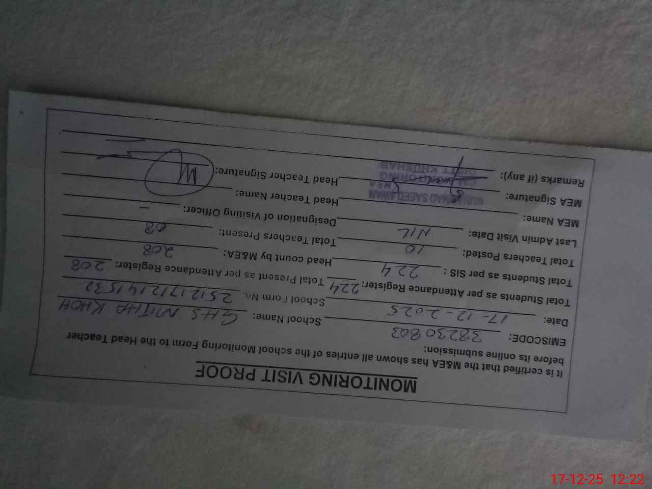 | Attendance Register | Head Teacher | MEA with School | Visit Proof |
