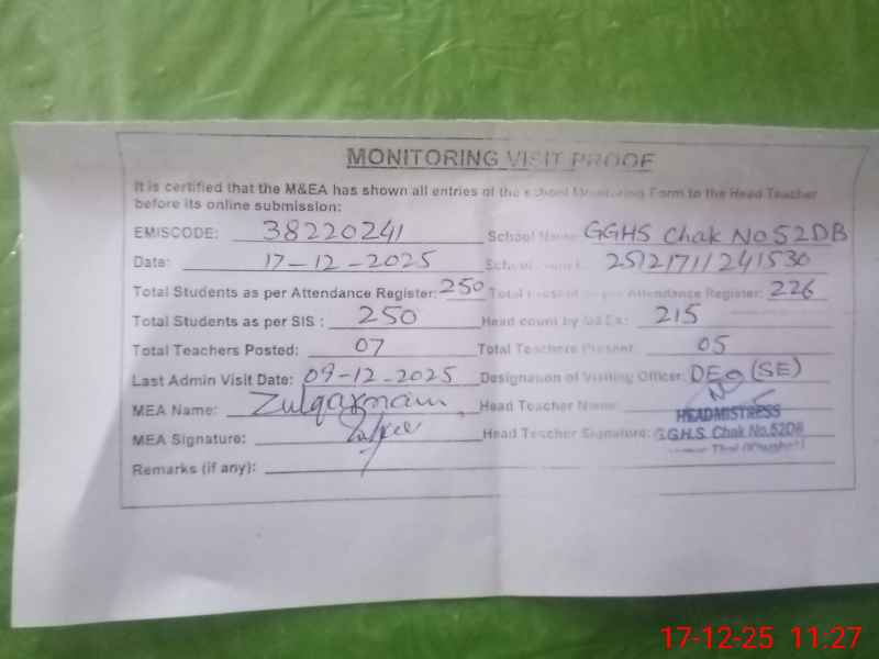 | EMIS Code: 38220241 | Name of School: GGHS CHAK NO. 52 DB NOORPUR | |||