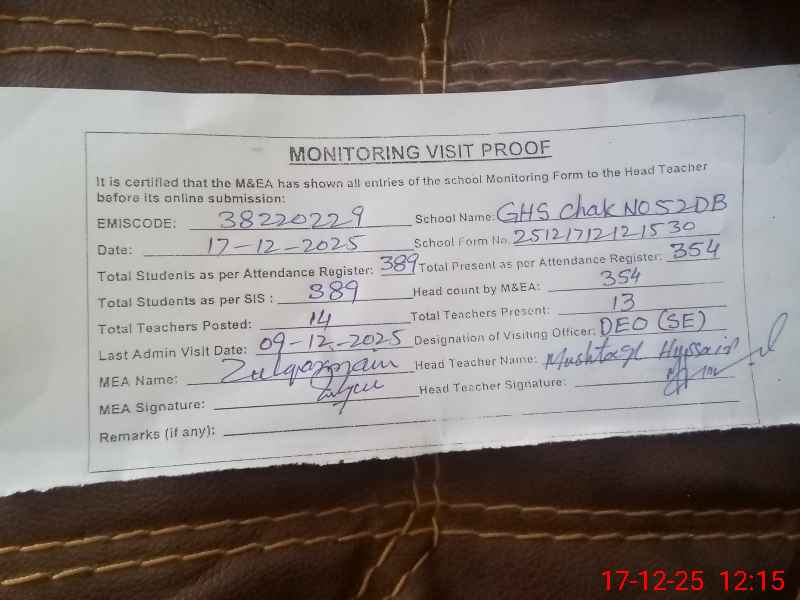 | EMIS Code: 38220229 | Name of School: GHS CHAK NO.52 DB | |||