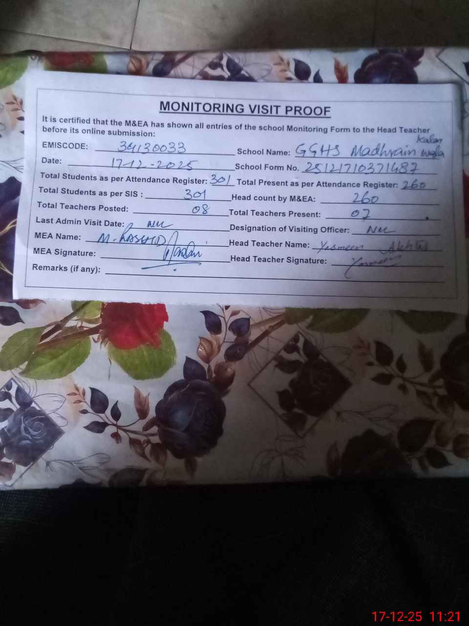| EMIS Code: 34130033 | Name of School: GGHS MADHRIAN WALA KALAR | |||