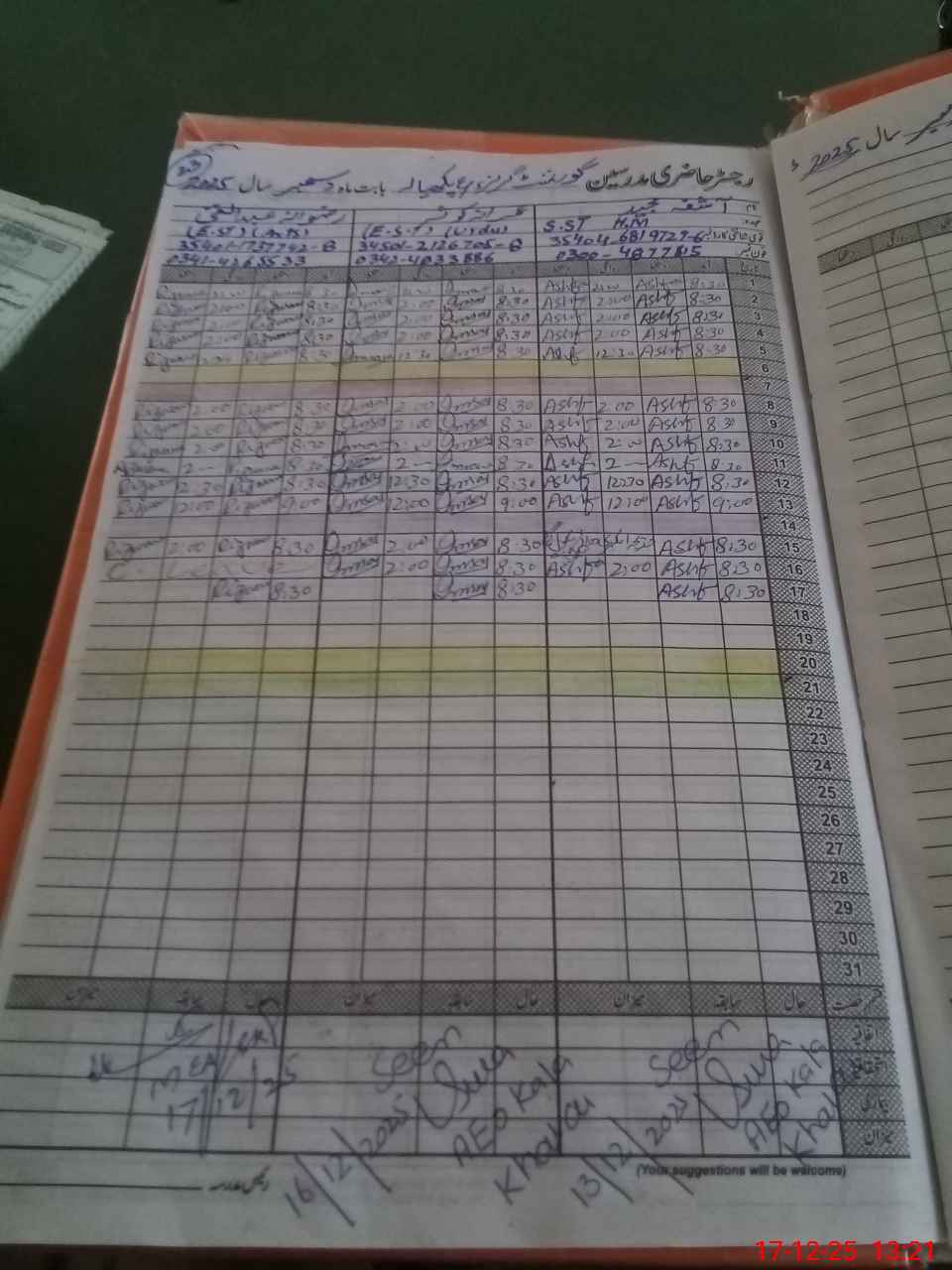 | CNIC | Full Name | Designation | R/C | Absence During Last Calender Month |