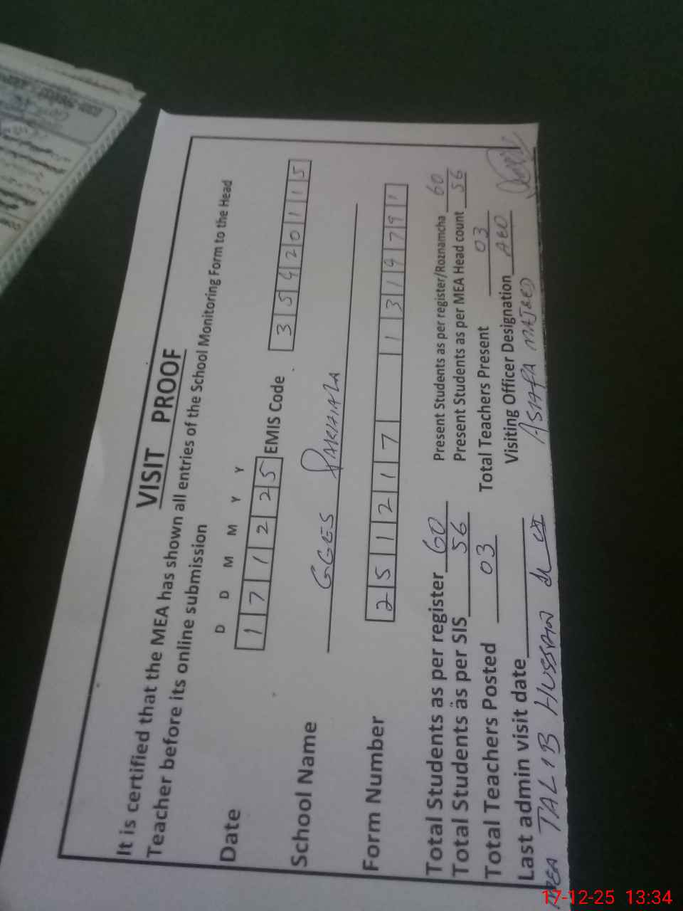 | Attendance Register | Head Teacher | MEA with School | Visit Proof |