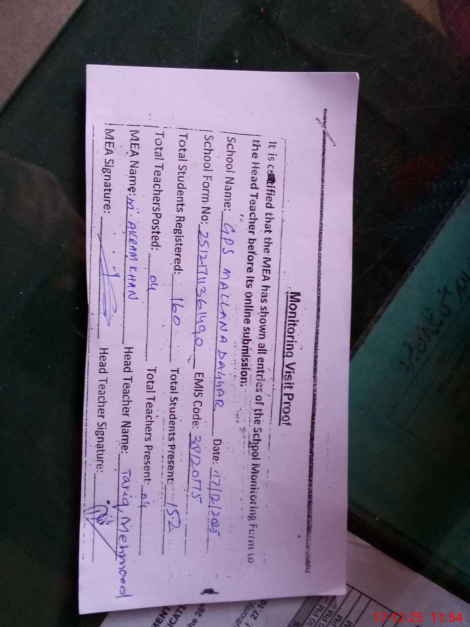 | Remarks (Use Separate Page if Required): Last visit of AEO Tahir Iqbal on 17 December 2025 and Dy DEO Rana Sajid Rafique on 16 December 2025 and NSB record not maintain and boundary wall under construction | |||||