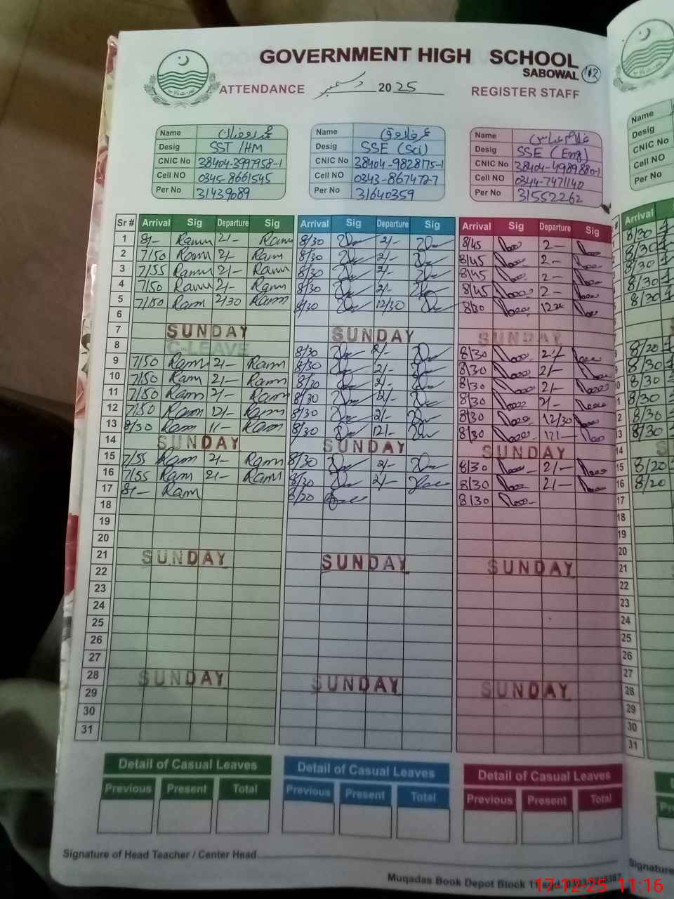 | CNIC | Full Name | Designation | R/C | Absence during last cal. month |