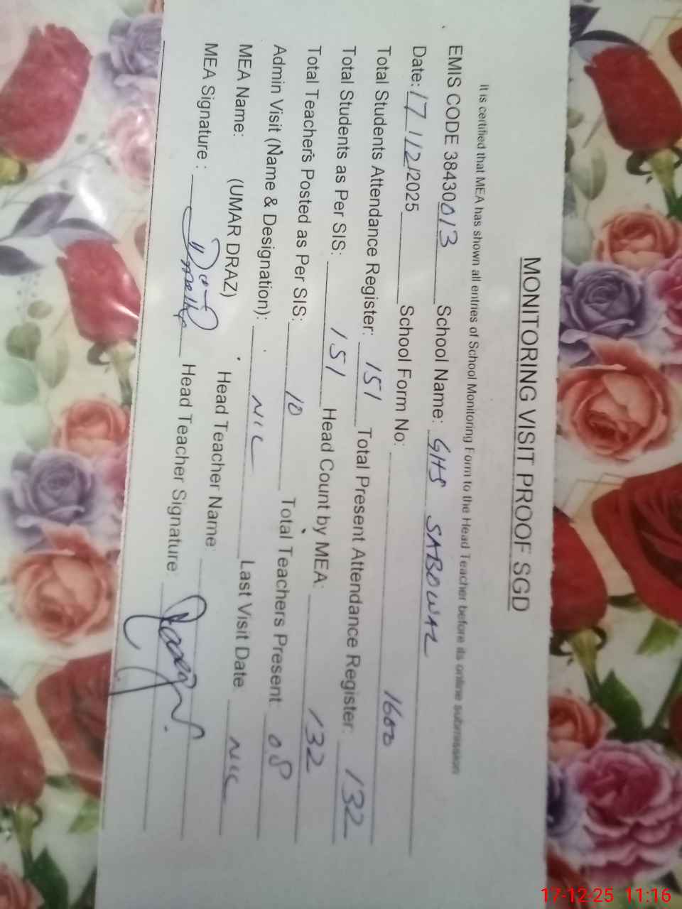 | Attendance Register | Head Teacher | MEA with School | Visit Proof |