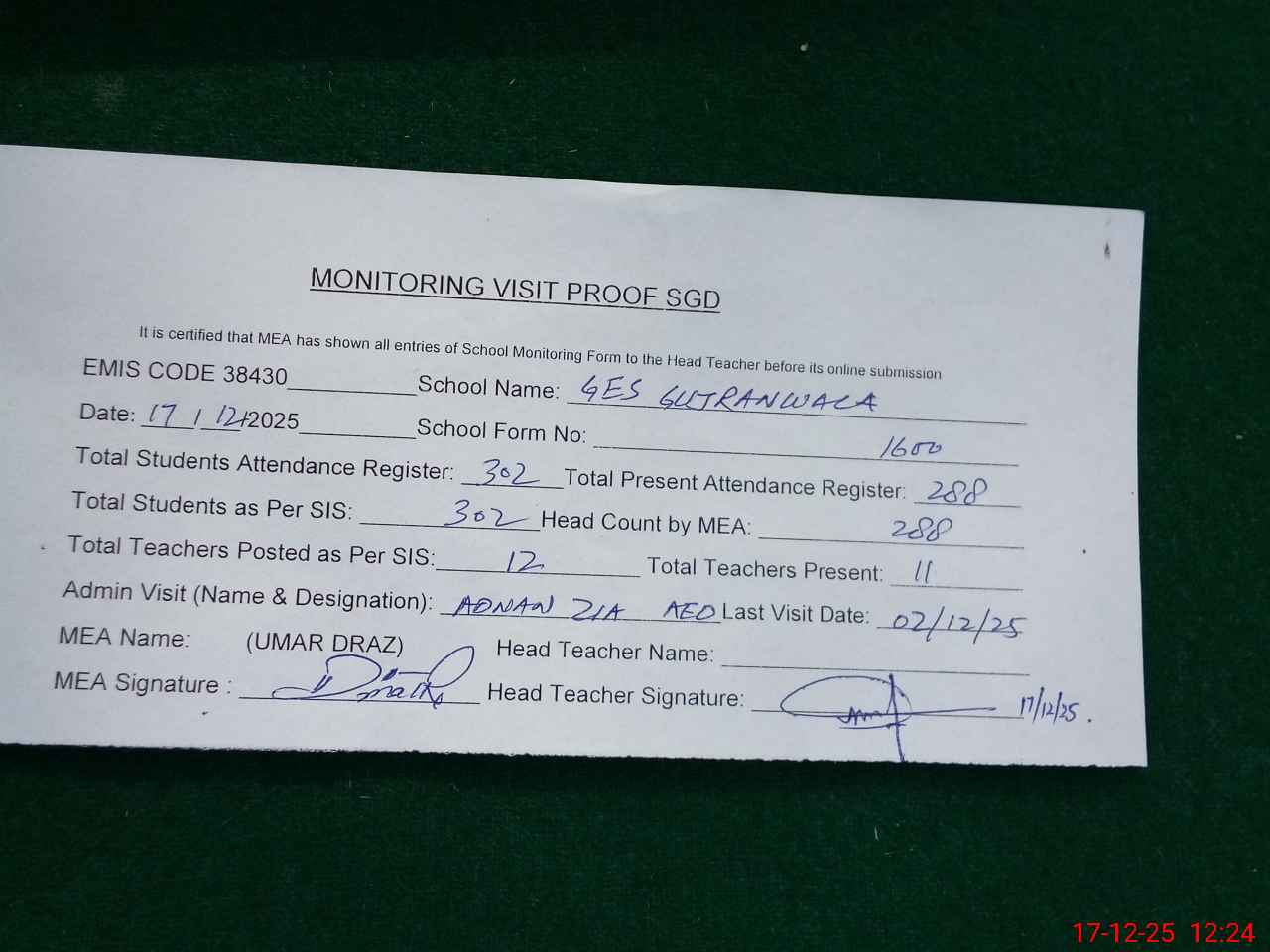 | EMIS Code: 38430051 | Name of School: GES GUJRAN WALA | |||