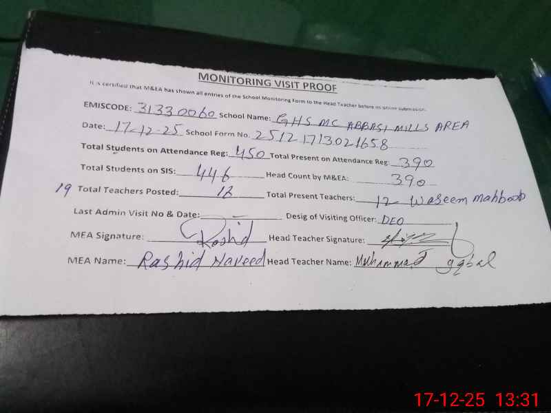 | EMIS Code: 31330060 | Name of School: GHS MC ABBASI MILLS AREA | |||
