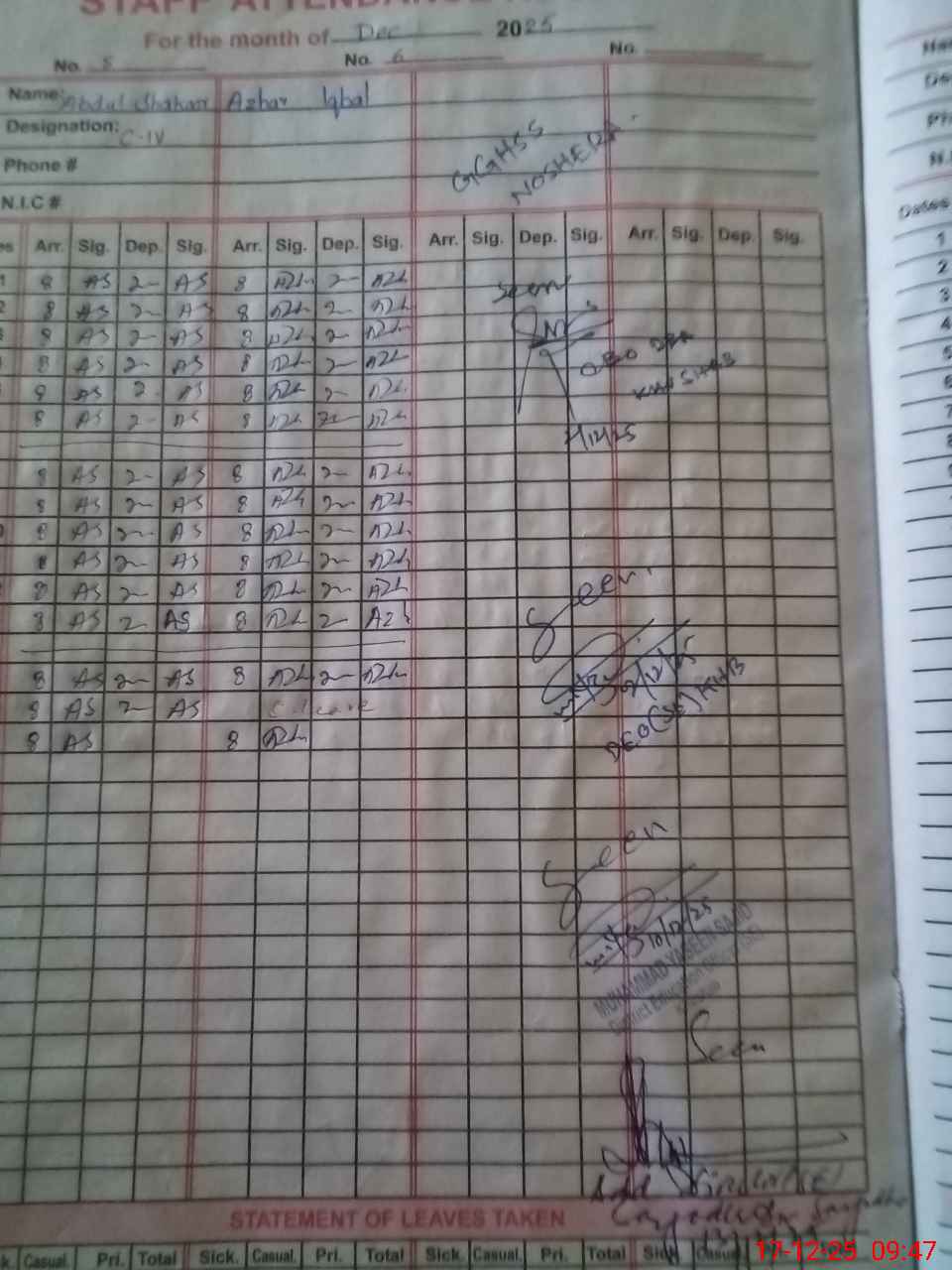 | CNIC | Full Name | Designation | R/C | Absence During Last Calender Month |
