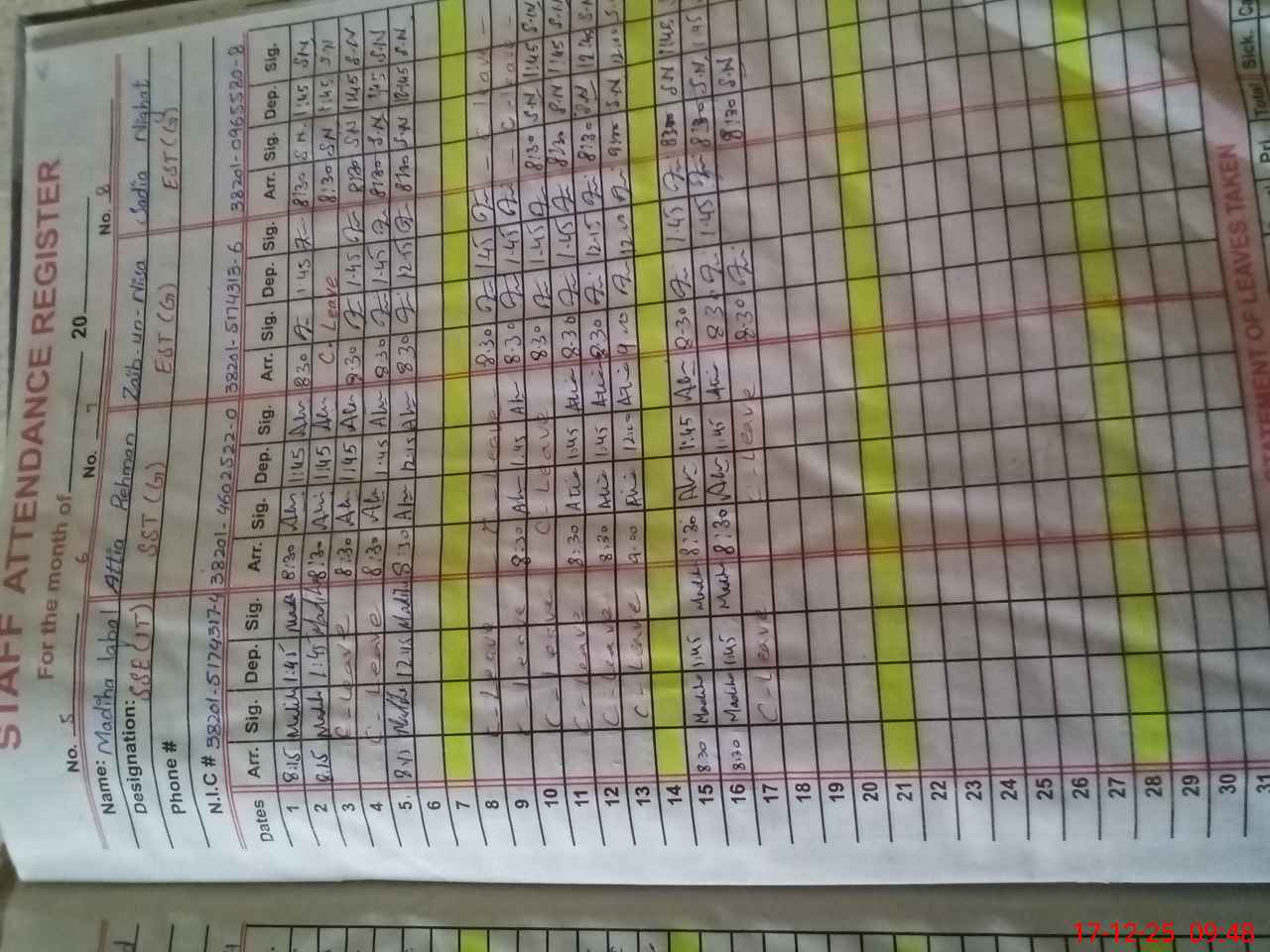 | CNIC | Full Name | Designation | R/C | Absence during last cal. month |