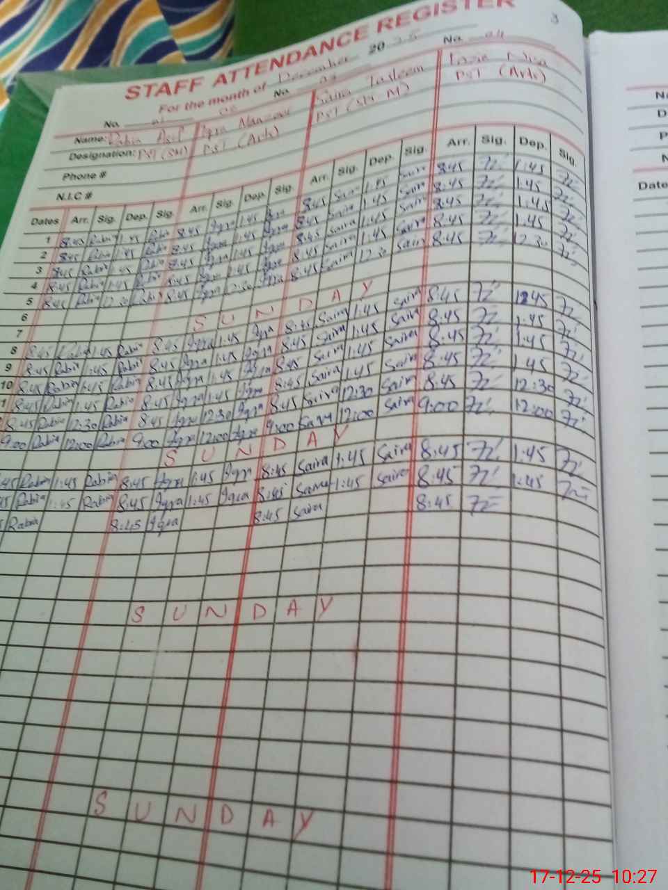 | CNIC | Full Name | Designation | R/C | Absence During Last Calender Month |