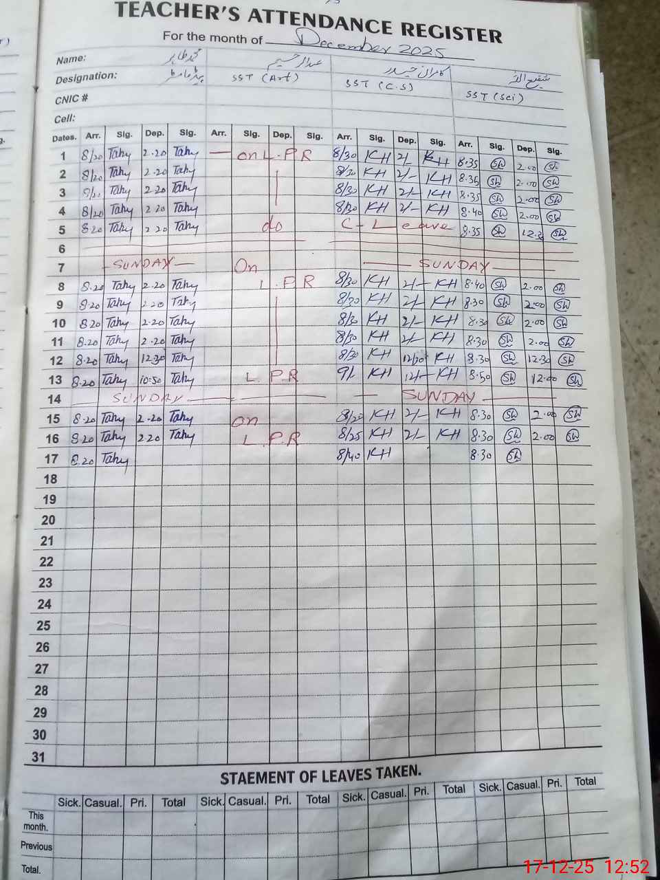 | CNIC | Full Name | Designation | R/C | Absence during last cal. month |